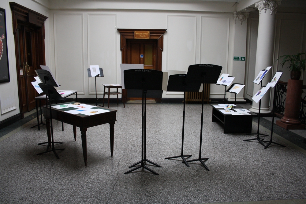 In 2012, Wallace negotiated with the host organisation, Scottish Opera, to allow access for individuals to see the conclusion of his residency at their private administrative offices at 39 Elmbank Street, Glasgow. I slipped out of a busy group residency where the Mackintosh Museum at The Glasgow School of Art had been transformed into an open studio [2], to visit a building that I had not realised existed, only ten minutes away from my place of work. Once an engineer’s office, the building has a sense of grandeur, with a sweeping staircase that leads up to the landing. Wallace described to me the time shift he felt within the building: “You can look through the windows and where the masts of the ships once were, now the lines of the multi-storey balconies float in front of your eyes.” Here on the first floor landing, I found an ‘orchestra’ of his works, placed in a semi circle on music stands, all lit by natural light from the cupola above. I remember feeling privileged at having been invited for this one-to-one encounter. It is strangely unusual to feel like the work has just been placed there for you to see it.