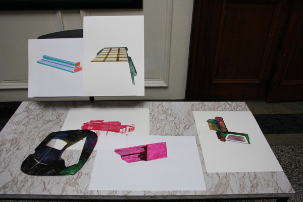 Ally Wallace has since 2011, undertaken a series of self-initiated artist residencies in different kinds of buildings, ranging from offices to museums [1]. Each time, at the conclusion, he uses the space he has been working in, whether its walls or objects found within, as his ‘page’. From large paper works and structures to small watercolour studies, all hold details from the surroundings and are presented back to the building, its inhabitants and visitors. The elements he chooses to focus on, whether a section of marble balustrade or a detail from a museum collection, float as fragments on the white page. Whilst still recognisable, the images are always translated into a different colour ways than their real nature. A green piano is placed on the green baize of a writing desk. The pink fold of a marble staircase is given a brown shadow. The act of showing the ‘copy’ within the original space where it was created, affords the viewer a new reading.