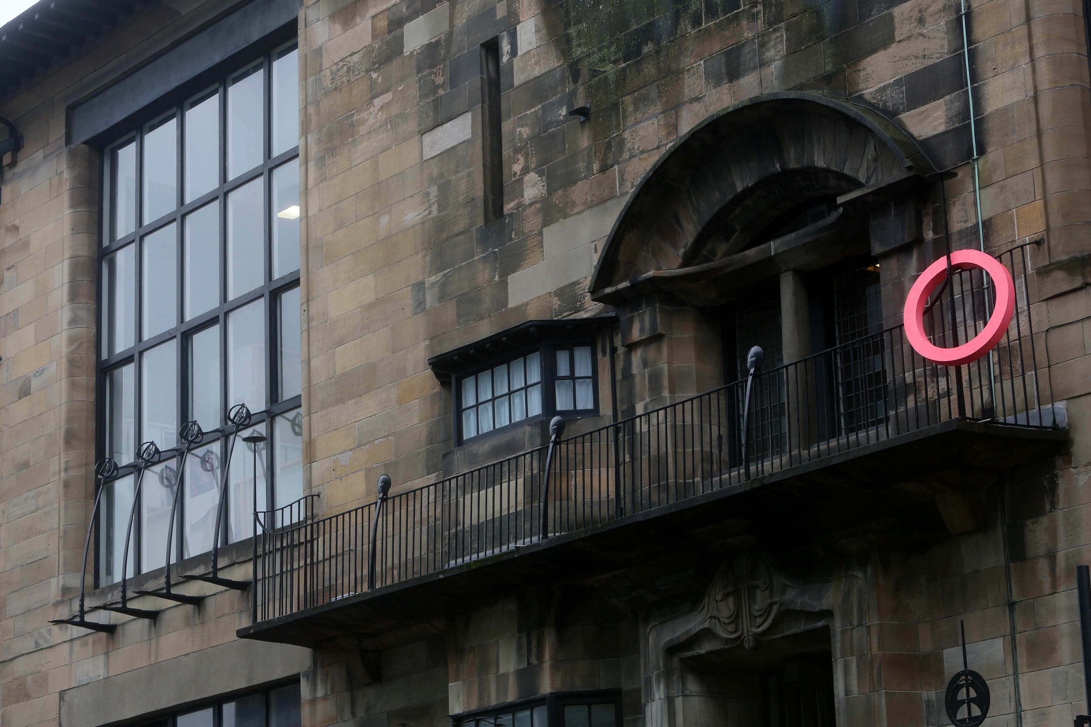 Looking across to the Director’s Balcony on the Mackintosh Building, the ‘O’ placed on the railing is an open mouth on the façade [12]. After all, ‘façade’ is derived from the French for ‘face’. The ‘O’ also mimics the circular shapes of Mackintosh on the building’s iron work or even the glass globes on the Mackintosh weathervane. Look up. It is also like the ‘O’ of the ‘driven voids’ which are three architectural features to be found in the Reid Building.