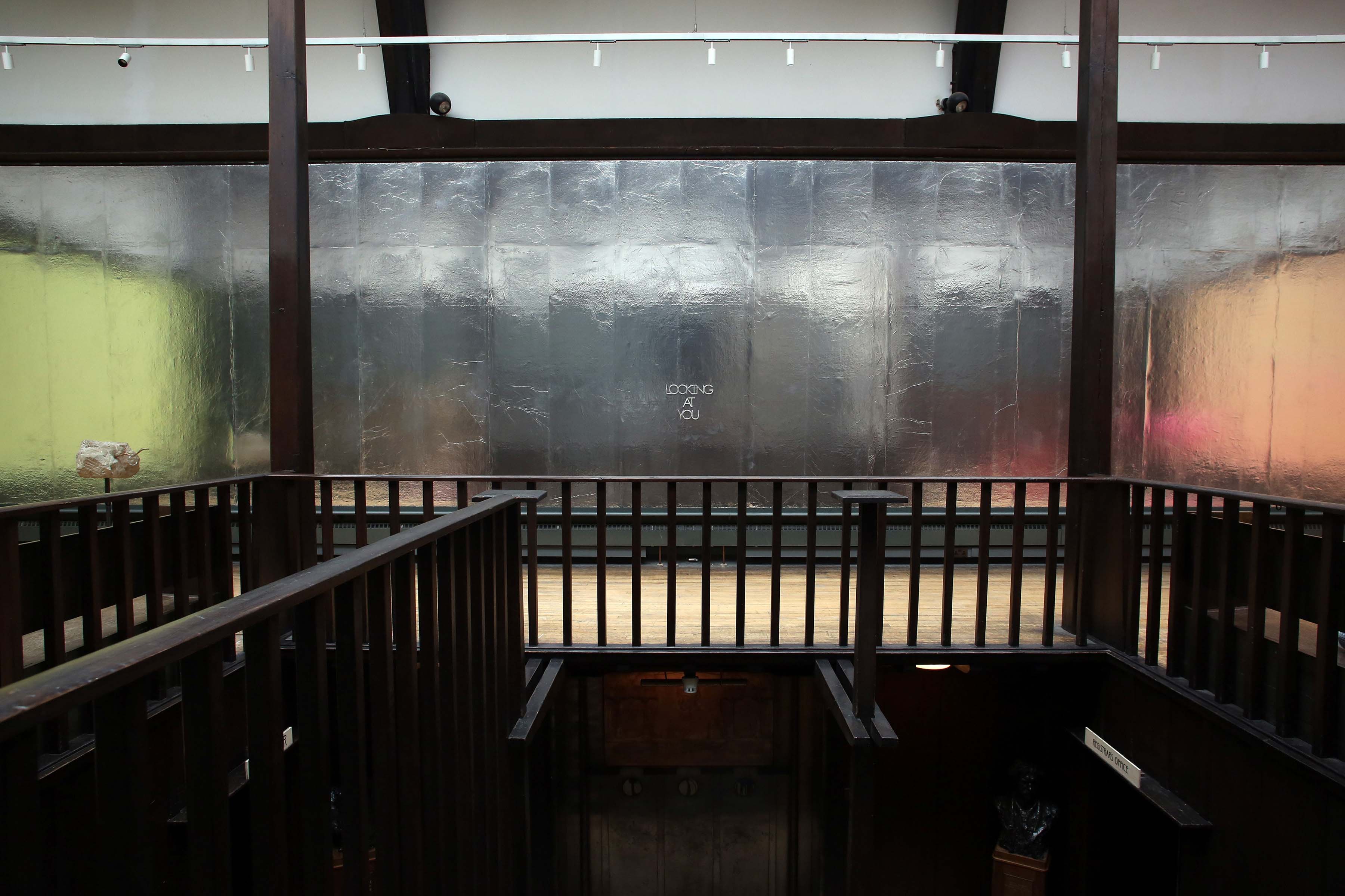 What are we looking at in the Mackintosh Museum? Does it look back? The silver foil creates a smooth new skin on the longest wall. It offers up a new depth in the room. To the left, the reflection of the yellow-washed side wall folds back through the silver into infinite space. The painted right hand-side wall is reminiscent of a dawn or sunset, with the Mackintosh Museum’s resident headless Nike ‘facing’ towards this landscape composition. Both colour walls create a glow upon the burnished copper of the two Museum display cabinets which have been revealed for this exhibition and treated like sculptural objects. The polished glass on the case to the left of the director’s doorway becomes a mirror. The dark denim panel inside it provides a clear back drop and depth. Looking at me. There are no glass panels on the display case on the right. It is the same but different.
