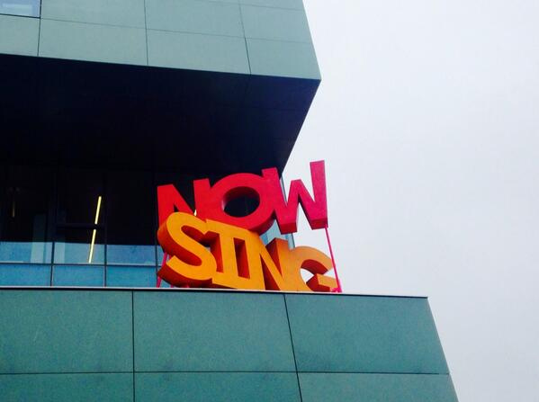 The words ‘NOW SING’ have been handmade by the artist – a truly monumental endeavour. The orange of NOW and the pink of SING echo the beginning and end of one day [10]. To say NOW is strange, because as soon as it is said, it is in the past. The viewer will walk past NOW SING on the way in, and see NOW SING, later on the way out. NOW SING could be directly asking something of us or be a declaration of intent for the new building.