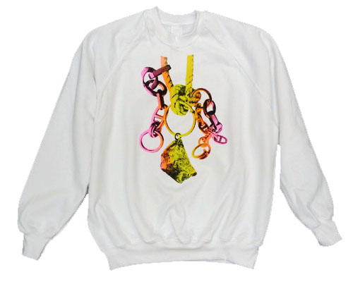 ‘SWEATS Lovesong; Song (ring, chain, rope, nail, rock)’ (2012), Michael Stumpf. Ongoing series of screenprinted sweatshirts.