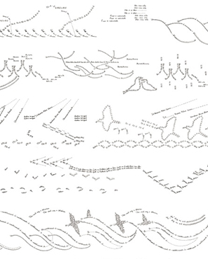 Tracing the lines that Campbell’s correspondence took from the island as he compiled a Gaelic dictionary is like following the flight path of birds. The correspondence shuttled back and forth between Canna House and destinations from all over Scotland and the world, in the days before the internet. There were letters from Sister Veronica in Nova Scotia; Father Allan Macdonald on Eriskay; Annie Johnston from Barra (Tuulikki drew from Campbell’s recordings of Annie Johnston and her husband Calum); and correspondences with academics from the universities of Edinburgh, Glasgow and Aberdeen amongst others. They worked with Campbell to try and pin down Gaelic for phrases like ‘a crop of pimples or to describe specific types of seaweed or on phrases relating to ‘Strange Things’.[11] These lines of words in flight are very much present in the beautiful notations of Tuulikki’s scores for the performance, where the lyrics can form the chord [12] of a wing or denote the lift and fall of a bird in flight.
