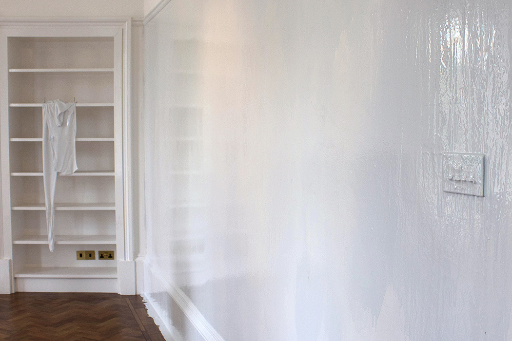 One of the stand-out works in the exhibition is ‘Stratum Coneum (horny layer)‘ (2014) by Switalski. A grey silicone ‘skin’ coats an entire length of wall, covering even the light switch. ‘Le Moi-peau‘, translating as ‘The Skin-ego‘ (1974) by Alain Didier, details his psychoanalytical theory on the skin as interface for the individual, a container of ideas and boundary marker between inside and outside. Didier quotes Sylvia Plath, who at a formative level, experiences a severing of connection with her mother when as a two year old she is superseded by another baby: “I felt the wall of my skin. That I am I. That a stone is a stone. My beautiful fusion with the things of this world was over.” [7]