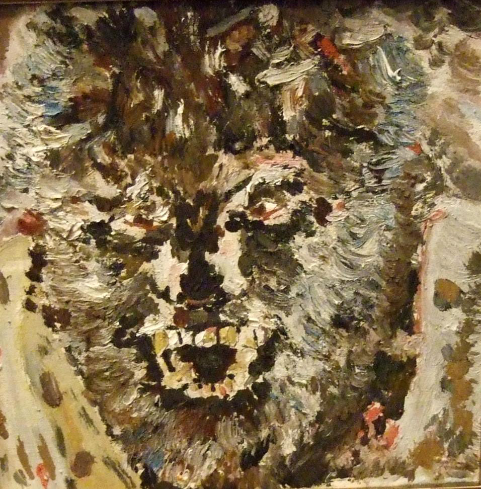 There are new paintings of the city captured in its bustle, with crowds thronging at Glasgow Central Station and another one capturing the festival atmosphere of the June festival the Glasgow Mela. There are a series of scenes which come from further afield from his past travels to Paris, Venice and Amsterdam. Surprisingly, another strong theme is films. One particularly eye-catching image sees a werewolf’s head crowding the frame with his fur painted in thick impasto. Mackintosh tells me he has also made a painting of Doctor Who’s tardis. A particular favourite of mine is a painting of a woman with her dog. He has captured the lean of the dog into her body, and introduced really contrasting planes of colour with a vibrant purple over her forehead, and white ‘socks on the sandy dog’s front paws. Mackintosh explains he is interested in the ‘pull’ of the picture; its ability to connect with a particular viewer to draw them into its depths. The painting should not be flat but have life in it. He always finishes what he starts, because if he doesn’t, he sees it “as the beginning of excuses”.