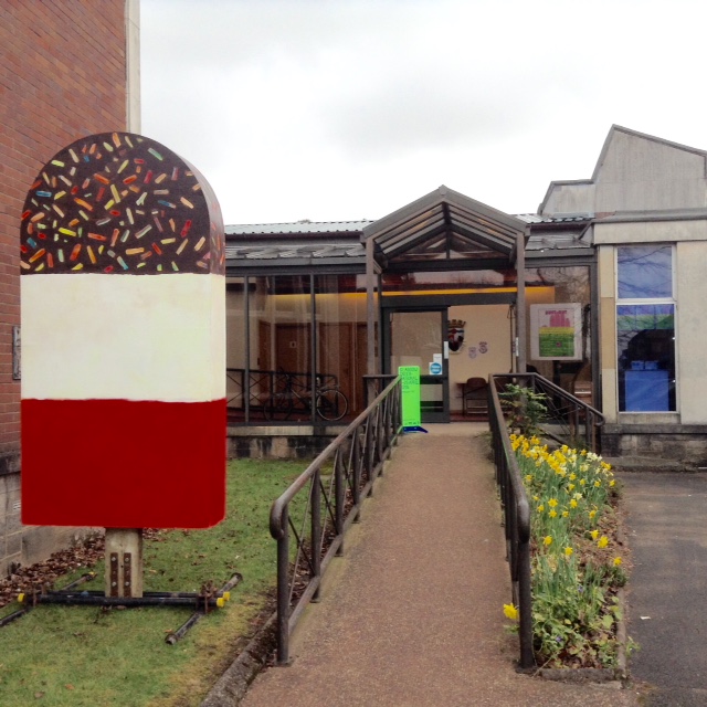 All caves have a threshold, an invitation to be considered by each visitor to enter or resist. What lies at the threshold of the Lillie? This gigantic, FAB erect ice lolly is a totem from an innocent age, an enticing treat to be licked and savoured (or if on a diet, or too serious an adult, scorned). It is a visual feast of simple ocular and oral pleasure. Where will you begin? What is your method of eating it? Which band of fruity colour will you bite into? Your synapses snap with the desire created by anticipation. A coldness of textural sensation, instantaneous joy and promised hundreds and thousands crunch follows.