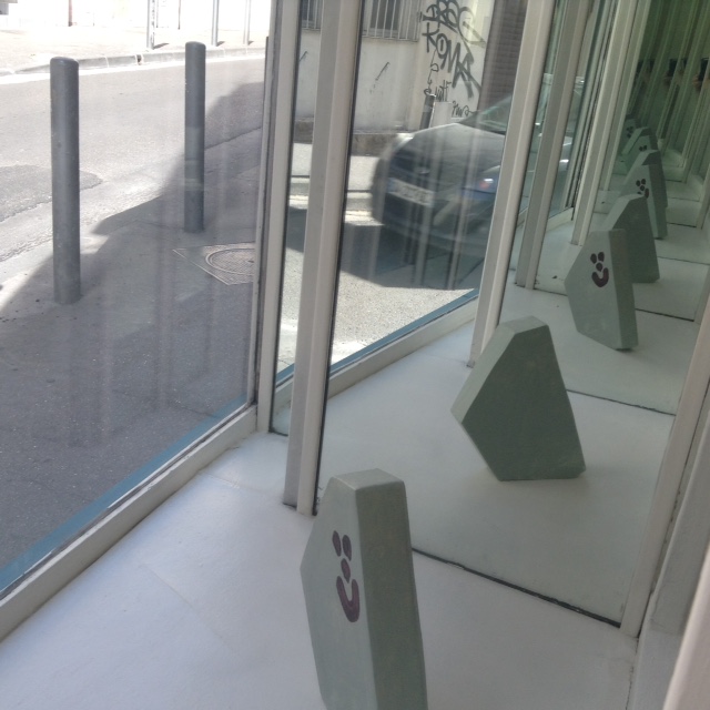 Marseille has a number of production facilities, including one for glass, which  were presenting exhibitions or projects as part of PAC. One building housed Atelier Ni, a sculpture workshop on the ground floor, and Tchikebe, a printmaking facility on the second floor. Atelier Ni hosted Selma Lepart, winner of their open call and Julien Fargetton. Atelier Ni was set up in 2010 by two artists, Arnold Degiovanni and Maxile Gianni, and is seen as a technical resource to assist artists and designers in the technical design and production of their projects. One of Lepart’s sculptures was technically highly ambitious – a breathing asteroid, where the small metal plates of its surface appeared to inhale and exhale. Atelier Ni had worked with Fargetton to help him in the construction of a Belgian waffle maker, fully operational and made from two Belgian manhole covers – real street food as the artist himself coined it.  Upstairs from Atelier Ni, was Atelier Tchikebe, an exciting printmaking studio with gallery. Tchikebe had been producing a series of new screenprints onto different surfaces including aluminium, mirror and acrylic glass, with Tania Mouraud, a multi-disciplinary artist working across performance, video and public art work. Often working in text, Mouraud declared on our visit that.. ‘one sentence will be in 7 cities’, on simultaneous billboards across Europe.