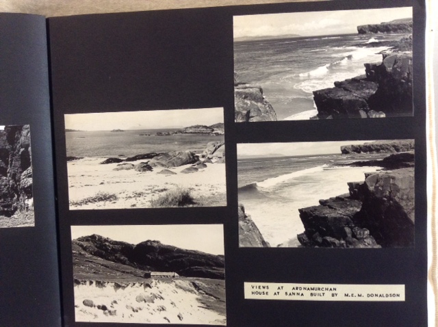 Intriguingly, Donaldson and Banks’ paths may have crossed at Donaldson’s distinctive home in Arnamurchan. In a set of black photograph albums held at Royal Commission of Ancient & Historical Monuments of Scotland, Banks dedicates one section to Ardnamurchan, with a page of four photographs captioned ‘Views of Ardnamurchan, House at Sanna built by M.E.M. Donaldson‘. Banks frames the low buildings of MEM Donaldson’s home in the middle distance, nestled with a small hill behind and close to the edge of a low dune. The photograph with caption provides the first physical evidence that one photographer is aware of another, amongst the women who I have been researching that documented Scottish Highlands & Islands life in the inter-war years.