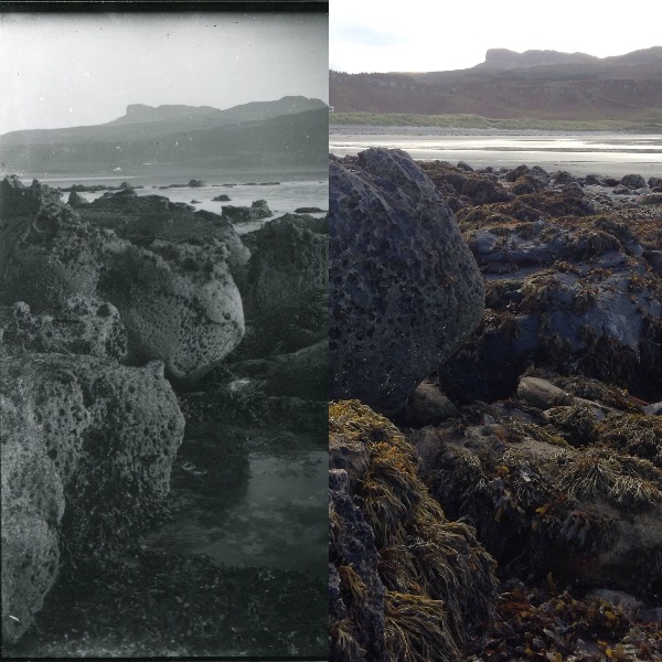 On the Saturday ferry over from Mallaig to Eigg, I showed digital images of MEM Donaldson’s series on the island to Lucy Conway (the host of Sweeney’s Bothy with her husband Eddie Scott) and another islander, Eric Weldon. They immediately helped identify locations. A further resource has been the impressive, ten years in the writing, ‘Eigg: The Story of an Island‘, [2] by local resident Camille Dressler. This book is part of an excellent compact collection called the ‘Walking Library’ [3] at Sweeney’s Bothy. Dressler recounts that Donaldson stayed at Laig Farm, on her visits to Eigg, which in that period as well as a working farm was a Temperance Hotel. [4] Two of Donaldson’s photographs show the farm. The first shows the start of the path down to the farm, with the gateway at the side of a cliff-face. The second denotes Laig Farm’s grouping of low buildings, in a small valley with a sandstone headland rising behind [5]. Laig beach, close to the farm, is the site of third photograph, which shows a woman, likely Donaldson’s companion, the illustrator Isobel Bonus, walking along the gray sands. The distinctive silhouette of the island of Rum lies on the near horizon. Donaldson takes another photograph at this location; a detail of the strange fossilised stones found at the south end of Laig beach.