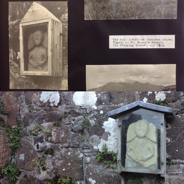 Both Donaldson and Banks photograph key landmarks on Eigg, in particular An Sgurr, the distinctive pitchstone outcrop, which the highest point of the island; also both photograph other ‘tourist sites’ at the Massacre and Cathedral Caves. Donaldson’s photographs of An Sgurr place it within the context of one of her walks, showing the approach to it from a route than can be traversed across a plateau. Banks chooses to show An Sgurr by placing a woman in scale with ‘the Nose’. Both Donaldson and Banks also separately photograph the loch to be found en route to the Sgurr, known as Loch nam Ban Mora – ‘Loch of the Big Women‘ – where the submerged causeway to the crannog in the middle could only be forged by a race of women of ‘supernatural proportions’. [10] The name refers to the Queen of Moidart’s warrior women, sent to murder St Donnan and his monks on Eigg. Lights from the dead bodies of the monks bewitched the women, leading them up to Loch nam Ban Mora, and luring the women one by one into the water, with all drowning. Both Donaldson and Banks also photograph the Sheela-na-gig, at Kildonnan Church. Sheela-na-gigs ‘are carvings, often found in churches, which consist of a female displaying, or drawing attention to, her genitals‘. [11] Alasdair Alpin MacGregor also photographed the Sheela-na-gig on his visit to Eigg.