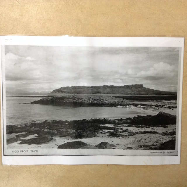 In 1935, Violet Banks established her own commercial photography studio in Edinburgh. Lucy Conway organized for me to speak about Donaldson and Banks with the Eigg History Society. At the event Camille Dressler identified that three of Banks’ photographs of Eigg, that appear in her photograph albums held by RCAHMS, are also held as facsimiles of postcards in the archive. The copies show images of Laig Bay, the Sgurr and a view of Eigg from the Isle of Muck, all bearing the credit ‘Photo: Violet Banks‘. This provides another use of Banks’ images, for commercial purposes, and another line of enquiry to follow up, in looking for the original postcards.