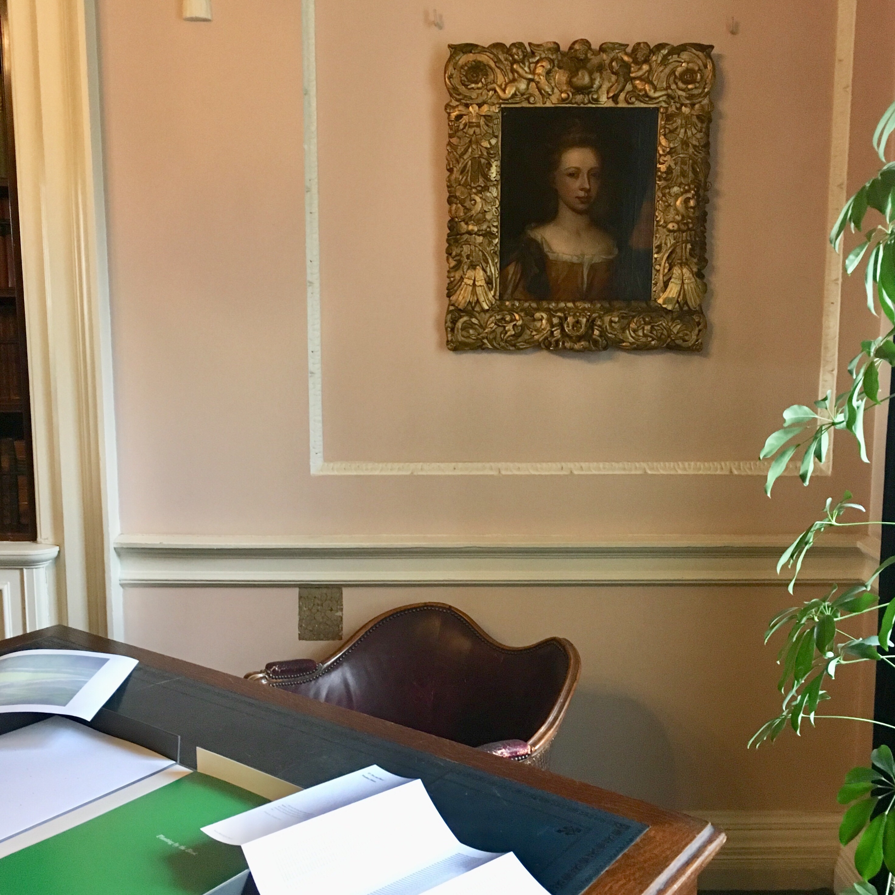 I first visit this painting at Glasgow Museum Resource Centre in Feb 2018. The work had been temporarily re-located to this store whilst building work was taking place in several of the rooms at Pollok House. I don’t want to miss any detail in this first meeting with her. Accompanied by the two museum curators who facilitate this visit, they stand aside whilst I look at the painting. I then examine the slim folder that accompanies it. There are no biographical details; the index only includes a curator entry on the condition of the painting. The gold relief frame, complete with heart and cherubs, seems at odds with the considered portrait within. The museum curators ask me if I wish for the painting to be turned over. The back is marked with a hand-painted inscription: ‘Mrs Salisbury or Priddon. Dahl Pinxt’.