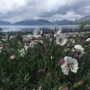 ‘At North Ballachulish you may see in the summer glorious fields starred with the white and gold of ox-eyes and corncockles, and framed with the vividly bright pink of the wild rose, furrows of meadow sweet beyond the sparkling waters of the loch, and everywhere the towering mountains stretching far up through Glencoe to the wild and lonely expanse of the moor at Rannoch, and to the head of Loch Leven.’ (P. 270)