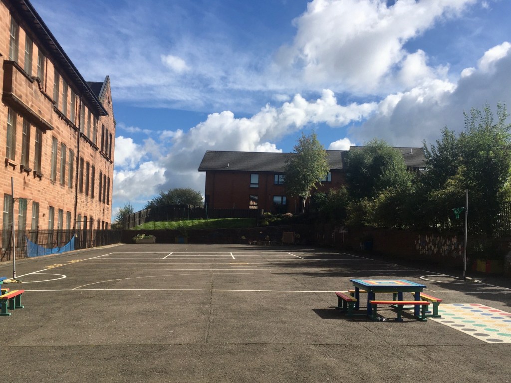 Eight of the Public Schools remain primary schools – Alexandra Parade (1897), Garnetbank (1905), Saint Denis’ Primary School (Dennistoun Public School, 1883), Dunard Street Primary School (1900), Sir John Neilson Cuthbertson Primary (1906), Al Khalil College (Abbotsford Public School, 1879), Royston Primary School (St Rollox Public School, 1906) and Elmvale Primary School (1901). Brightly coloured hippo, whale and pencil bins populated playgrounds. Chalk grafitti at child height circumnavigated the wall at Elmvale. A blue hula hoop had been successfully thrown to hook over a short pipe on the wall at Royston Primary School. Bunting, messages of hope and Covid-safe banners were instigated on walls and railings to welcome back pupils.