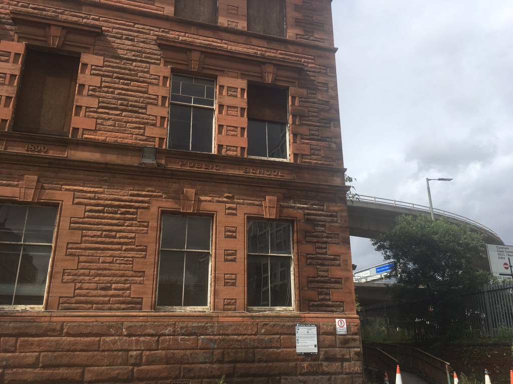 Green Street is a stone’s throw away from Bellgrove Street. It is book-ended by two vacant Glasgow Public School Board buildings- Tureen Street and St James’. Buddleia was reclaiming both, spilling out over the guttering, and in the case of St James’, sprouting profusely over the front elevation. Bushes were forming their own High Line park around the roof of Tureen Street. These became the first School Board of Glasgow buildings that I visited over late July until 30 September 2020. I resolved to make a series of walks during Phase 3 of Scotland’s Route Map, to the remaining- by my calculations- thirty-one schools across the city. [1]