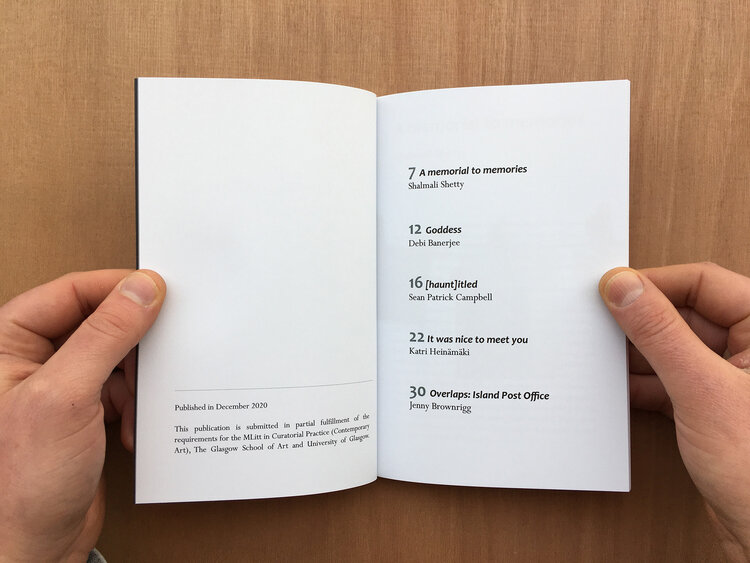 I was invited by Shalmali Shetty to write a short piece for her publication this cloud may burst (2020), which was submitted as part of her GSA MLitt in Curatorial Practice (Contemporary Art). Shetty invited four researchers and artists – Debi Banerjee, Sean Patrick Campbell, Katri Heinämäki and myself – to reflect on ideas of loss and preservation of memory around their use of archival material in their work. The publication has an overview A memorial to memories by Shetty.