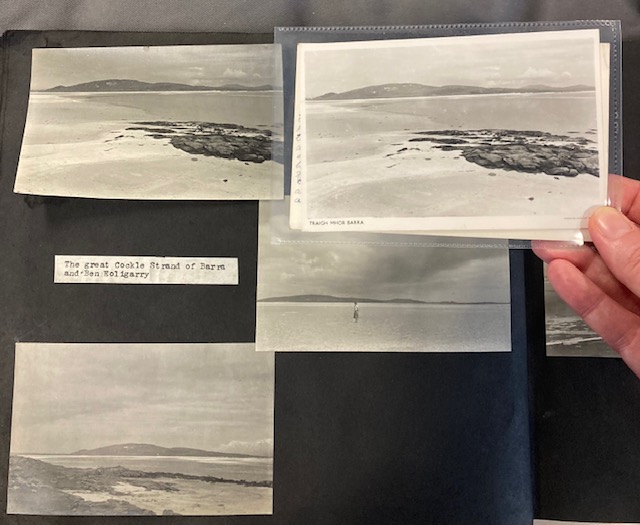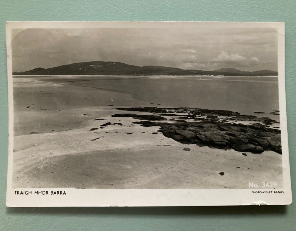 From the postcards I’ve collected to date, Barra has been the main subject. All have their originals in her album ‘A Book of Barra’. Photographic locations include Castlebay, Kisimul Castle, Loch An Duin, Traigh Mhòr, Traigh Eais and Northbay. Messages on the back of postcards show that the latest was posted in 1966, around 30 years after Banks’ visit. Banks’ Traigh Mhòr postcard in particular has had several reprints. The beach name appears mostly in Gaelic on the postcard title, but also as ‘Cockle Strand, Barra’. This postcard’s popularity could be due to this particular beach being famous as the landing strip for Barra Airport, which opened in 1936.