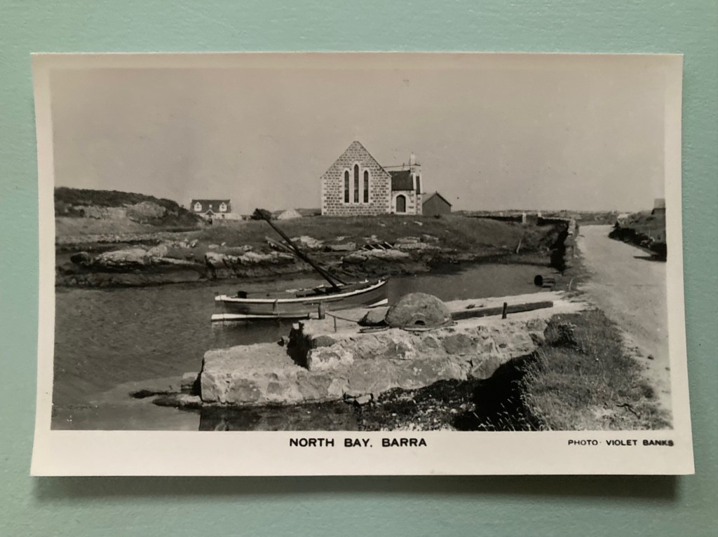 In the case of Banks’ postcard of St Barr’s Church in Northbay, Barra, this particular church, bay and road was also the subject of a number of American photographer, folklorist and author Margaret Fay Shaw’s photographs. Shaw (1903-2004) moved to Northbay and Bridge House[3] in 1935. This was the first home she had with her husband, the historian, folklorist and Gaelic scholar John Lorne Campbell (1906-1996). There is a small bridge at the road junction at the corner of the bay which may indicate the former location of Bridge House. There are a number of photographs in Margaret Fay Shaw photographic collection, held at The National Trust for Scotland Canna House, showing the view from that particular point over the bay towards St Barr’s Church, which would seem to corroborate the location of their home. However, the corrugated iron version of Bridge House as it appears in Shaw’s photographs, no longer exists.