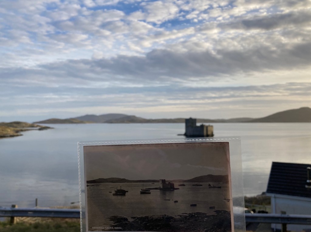 Back in Castlebay, which Banks’ captures in three photograph postcards, I could see she used what was to hand as part of her making her compositions. For example, in her photograph of Kisimul castle, perhaps she had to stand on the rocky outcrop down from Our Lady, Star of the Sea Church, in order to get the top of the castle almost level with the outline of Vatersay behind.