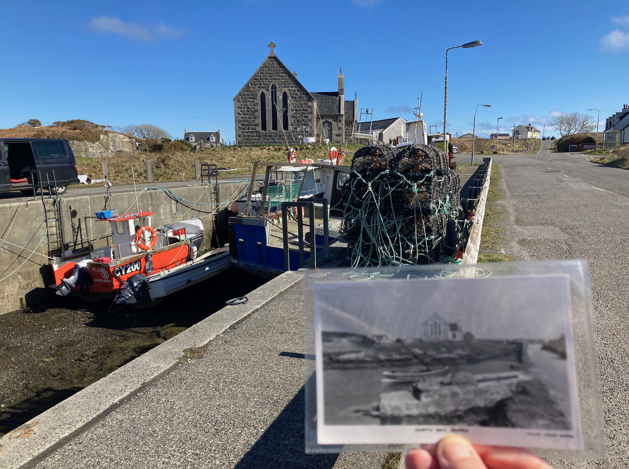 Less than an hour’s walk away from Traigh Mhòr is Northbay and St Barr’s Church, the subject of another of Banks’ photographs and postcards. The church was completed in 1906[2]. Whilst the old pier, a prominent feature in Banks’ composition has been replaced by a modern, concrete version, there is still the presence of boats. The addition of the cross to the church occurred after Banks’ photograph.