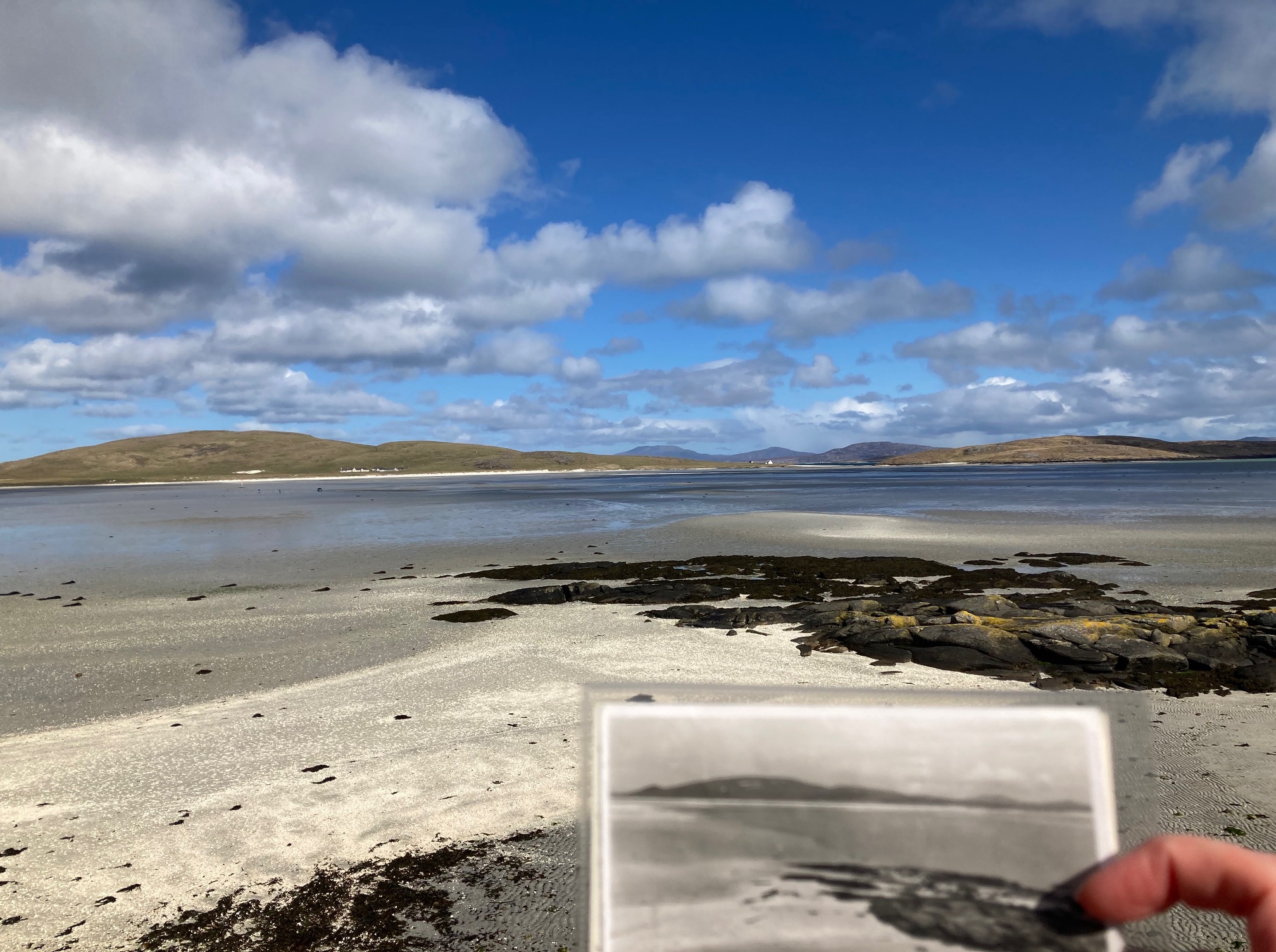 I visited Barra in March 2024. I began to look for the locations where Banks had stood to take her photographs. This method allows for serendipity as well as encountering local knowledge. For example, a local driver, parked in the spot at Traigh Mhòr where I had stopped to take the photograph, recounted that there had been a recent discussion on The Isle of Barra and Vatersay Appreciation Society Facebook Group relating to one of Banks’ photographs of Traigh Mhòr. Several people commented on the location as possibly being the burial site of an old woman where the grave had been lost with the road being built to the airport.