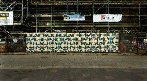 I invited Hopkins, as her practice involves working with what already exists in the world; making paintings onto surfaces that already contain information – such as world maps, patterned fabric and pages from books. I remembered the wind blowing the fragments of pages of the library books out of the building in the weeks following the Mackintosh Building fire in May 2014. Hopkins’ work, as part of the temporary perimeter in front of the The Mackintosh Building, responds to its location as part of a building site and busy loading bay. Dance Number forms and performs its own rhythm of hand drawn grid, with red, blue and black geometric shapes. It responds to the lines created by scaffolding, the pedestrian barriers and signs and the movement of people working on, in and around the building. Whilst Dance Number is a separate and unique piece, it has evolved from a chain of reproductions moving from the handmade to the digital.