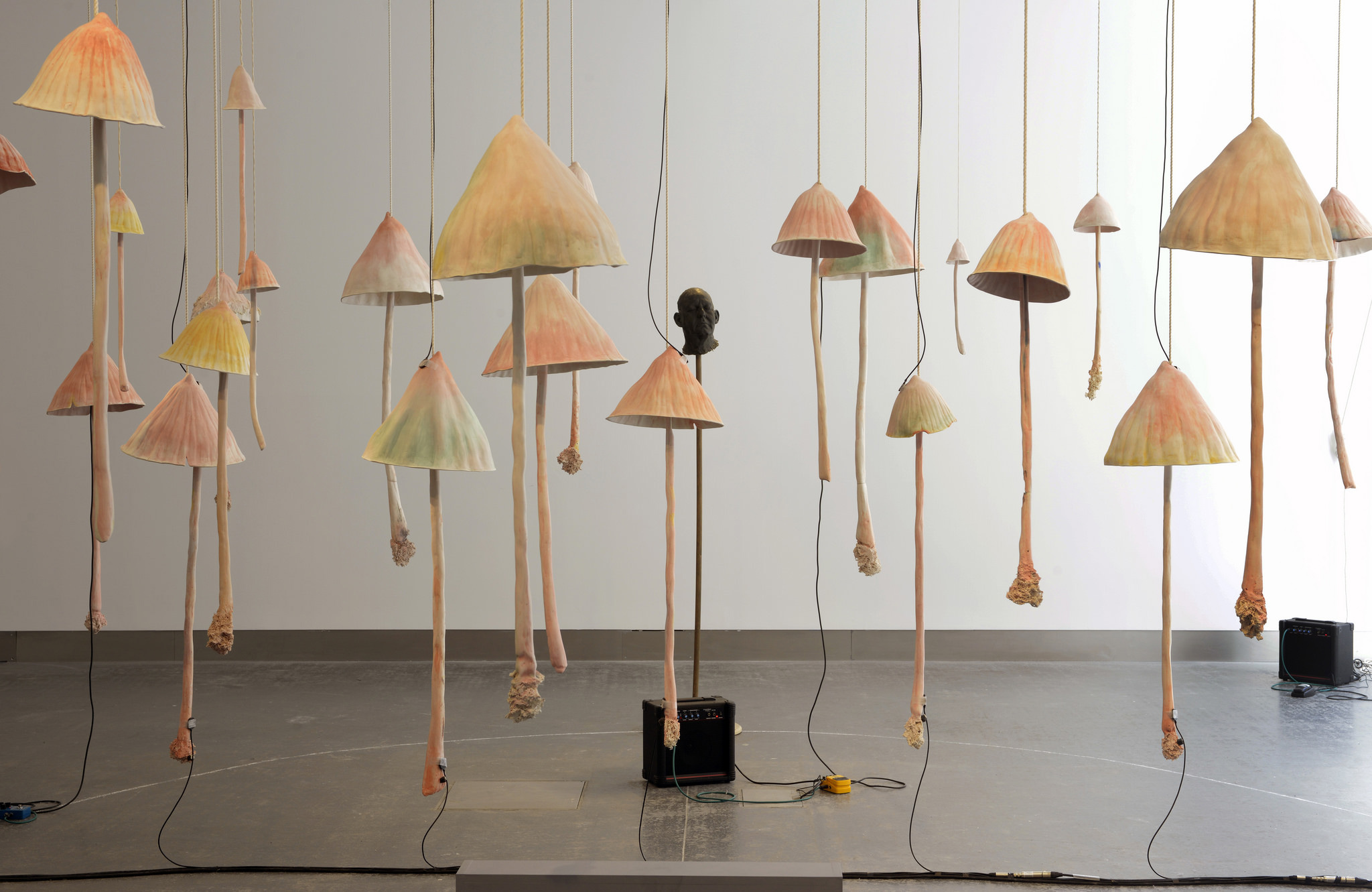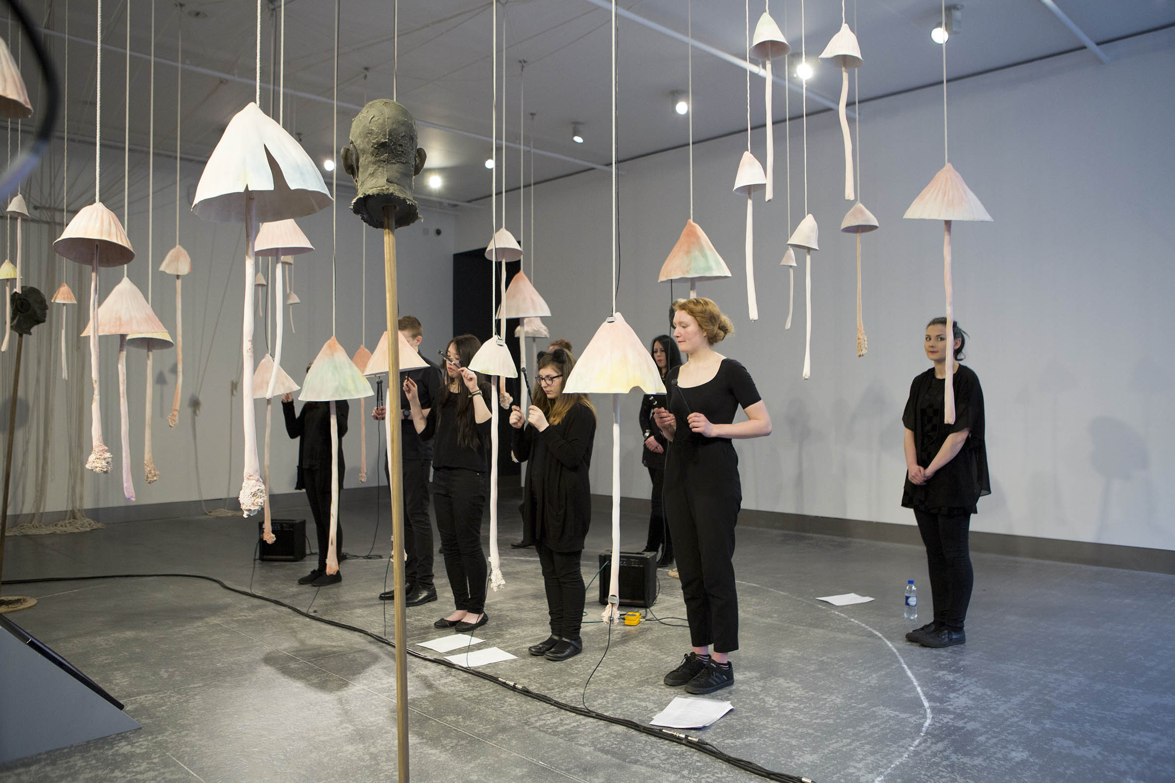 Korda produced a new sound sculpture for the Reid Gallery that combines her interest in primitive impulses, invented tradition and our skewed relationship to nature. The new work takes inspiration from the politically radical history of Garnethill (the surrounding area of the Reid Gallery), whilst considering the geographical significance of The Isle of Mull as a portal to the underworld. Korda will produce a series of sound experiments performed by an army of ‘Agitators’ gathered from the communities of Garnethill and Mull. In partnership with Comar, Mull. Alongside the installation of porcelain mushroom’s in Korda’s solo show, was an archive room comprising of artefacts that formed the basis of her research into the radicalism of Garnethill and its alternate spiritualities. These include loans from four archive collections including Glasgow Girls work from GSA Archives and Collections with a bookplate by Jessie M King and part of a teaset by Anne MacBeth; ephemera from Glasgow Women’s Library including posters and badges, from their early inception on Garnethill; loans from CCA, the Third Eye Centre archive, including film footage from guru Sri Chimnoy visits; and images from University of Glasgow’s R.D. Laing archive.