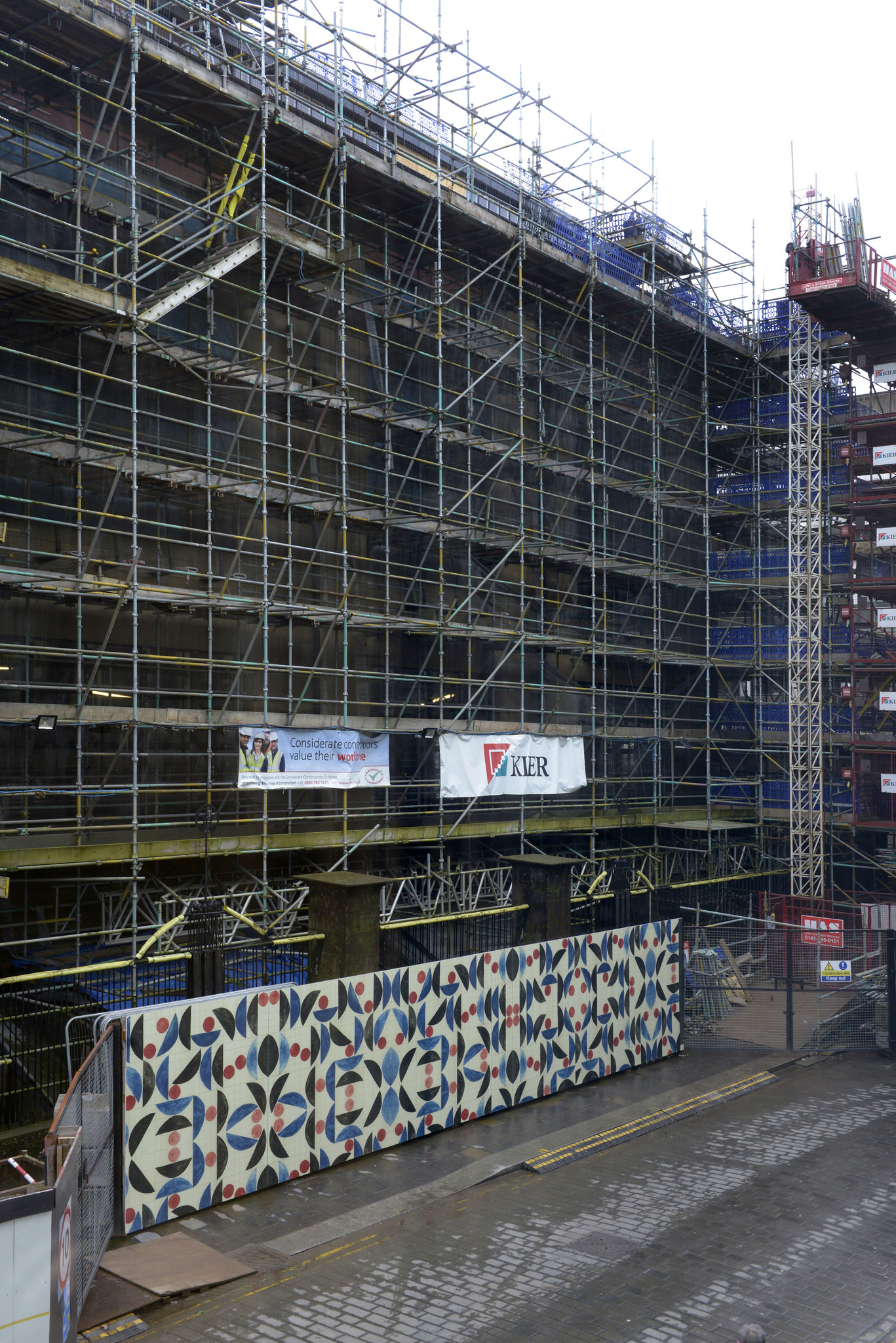 I invited Hopkins, as her practice involves working with what already exists in the world; making paintings onto surfaces that already contain information – such as world maps, patterned fabric and pages from books. I remembered the wind blowing the fragments of pages of the library books out of the building in the weeks following the Mackintosh Building fire in May 2014. Hopkins’ work, as part of the temporary perimeter in front of the The Mackintosh Building, responds to its location as part of a building site and busy loading bay. Dance Number forms and performs its own rhythm of hand drawn grid, with red, blue and black geometric shapes. It responds to the lines created by scaffolding, the pedestrian barriers and signs and the movement of people working on, in and around the building. Whilst Dance Number is a separate and unique piece, it has evolved from a chain of reproductions moving from the handmade to the digital.