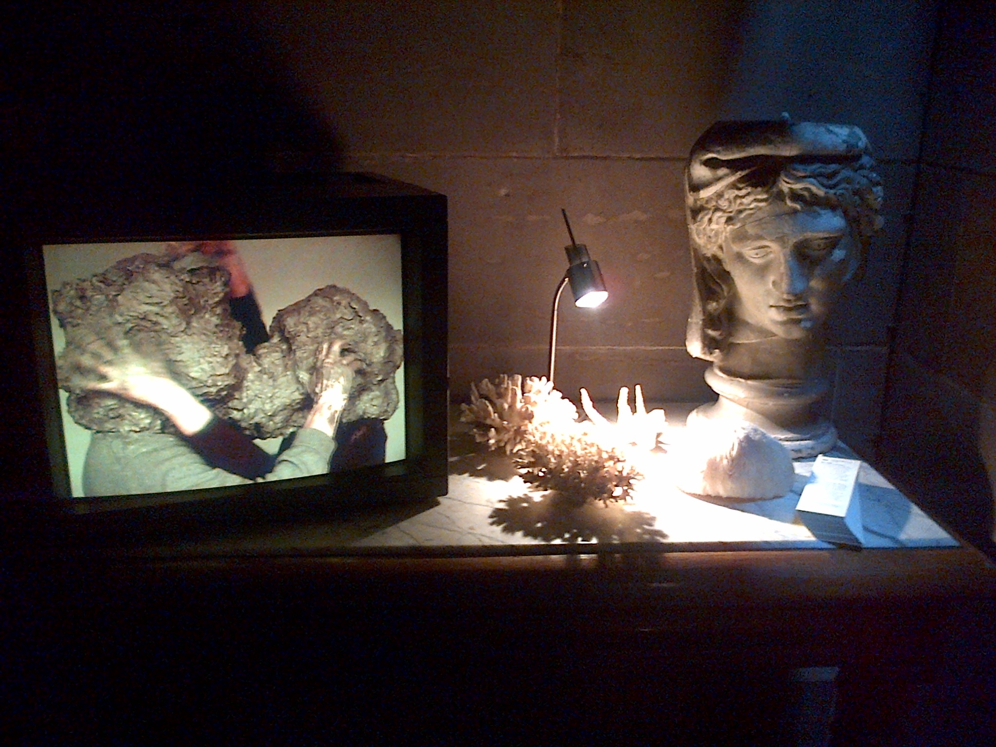 The under-stated exchange between the contemporary artworks and the ornate environment of Hospitalfield House is especially satisfying. Cobbing’s film of clay heads is placed on a reception table in the hall, alongside a small classical bust and a selection of coral. Labrović’s monitor is found on an ornate table in the Picture Gallery, surrounded by the portraits the Allan-Fraser’s commissioned from the Clique. A private domestic room is opened up for the projection of Copestake’s interview, which in its clever editing introduces informal asides to the format, cutting away to show the interviewer’s son at points, needing to be on his mother’s lap. The Smith/Stewart piece is shown on an old CCTV monitor installed above a door in the first floor doorway, against blue flock wallpaper. Behind the door lies the bathroom. The act of viewing four modest scale film works in this grand, historic environment, could have proposed them as interlopers, but combined with the careful placement and curiosities of the house itself, it shows they are no more strange or out of place than the other details, such as the iron cobras as the legs of the grate in the Picture Gallery’s grand fireplace.