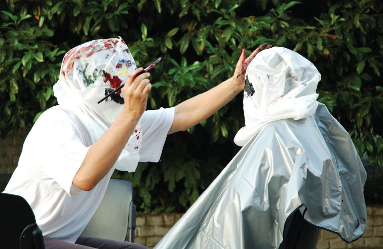 In all three houses, we encounter the details of the occupants, both past and present, by proxy, through an intimacy with the art and objects. Up in Arbroath, Patrick Allan Fraser demonstrated his love of art by association. He was in the favorable economic position to commission portraits from The Clique[4] a group of artists he had known from his time in London. This collective rejected academic high art in favour of genre painting, believing that their work should be judged by the public and not by the established elite. As we, the public, were invited to step inside and inhabit Hospitalfield House during this weekend, the four contemporary pieces, also transitory guests, explored different ways of dwelling within worlds created by the artworks themselves. In both Labrovic’s and Cobbing’s pieces, the protagonists and their partners occupy the very material they work with. ‘Mercantile Portraits‘, sees Labrović utilise the formal exchange of street portraiture, inviting a passerby to sit for his or her portrait. However, undermining the crowd-pleasing expectations of likeness and painterly skills, these portraits are blindly undertaken, with the artist placing white plastic bags over his head and the sitter, then painting directly onto the plastic surface, by feeling the sitter’s features through the bag. The results are child-like splodges.