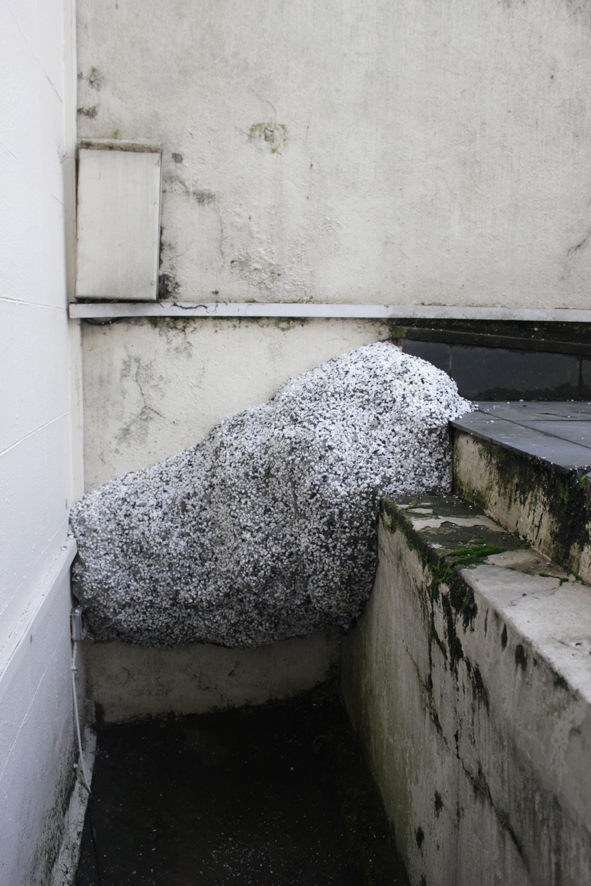 In amongst these familiar objects of 2 Lonsdale Road, a sense of unrest is introduced with a series of strange termite-like structures made out of grey pebbledash that nestle in corners. One sits high in the alcove of the open plan lounge and dining area; another quietly lolls against the skirting board of the stairs that lead down to the basement. The largest of these manifestations is to be found sprouting outside, in the sunken patio area, just below street level. It rises up to meet the exterior wall of the flat. These alien objects, introduced by Rachael Champion mutely announce their invasion to the street; the abstract art equivalent of a pest control van parked outside. When our homes become infested, we against our will co-habit with an element of wildness that is beyond our control.