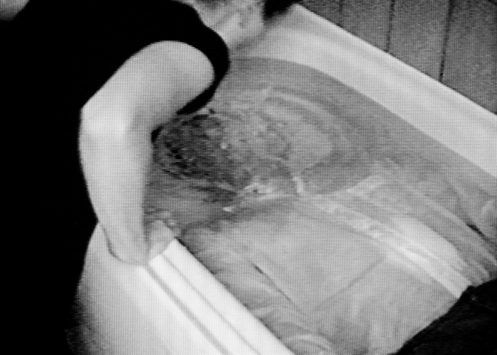 ‘The Kiss’ William Cobbing’s work, is again a tactile experience, this time with a couple locked together by their amorphous clay heads. The closest they can physically get to each other is with their hands, which slither across the other’s clay surfaces. In Smith and Stewart’s ‘Mouth to Mouth’, the male is submerged, fully clothed, under bathwater; his life reliant on the woman through her performing resuscitation. Anne-Marie Copestake’s ‘trigger tonic’ adopts the talking heads interview format, with Afterall editor Caroline Woodley in conversation with Swiss artist Pipilotti Rist. The film captures the circling conversation of questions and answers between interviewer and interviewee, with the former attempting to get closer and closer, through the spoken word, to inhabiting and understanding the artist’s motivations and intentions.