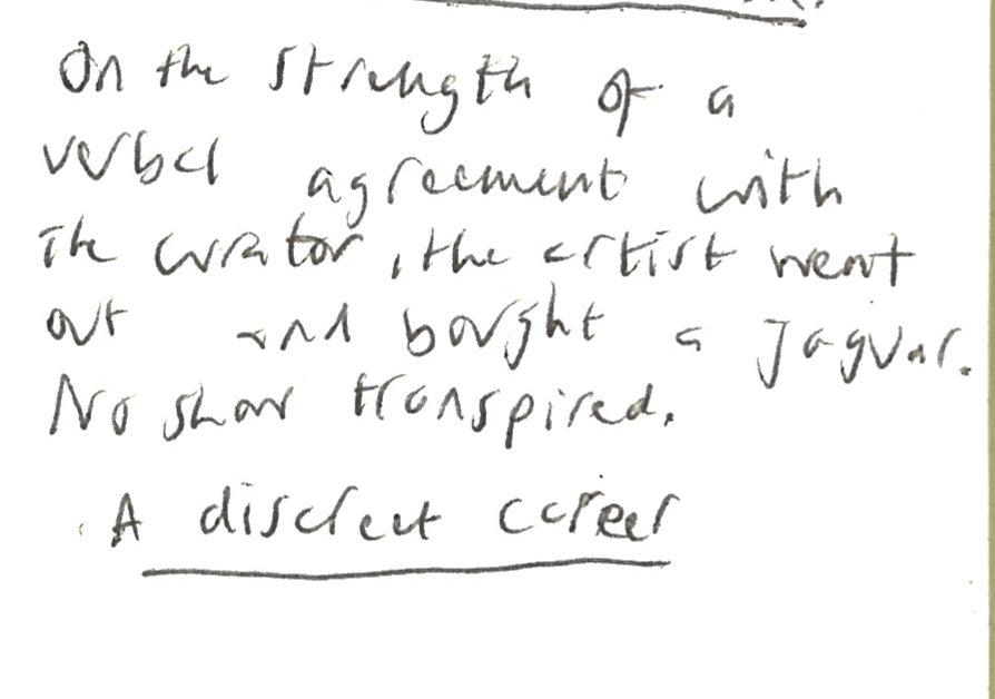 Please find on this website an ongoing selection of writing and also curated projects. The writing covers creative writing, writing on art, about artists, probably some incomplete thoughts and also publications. Curated projects include those done whilst working in institutions and beyond.