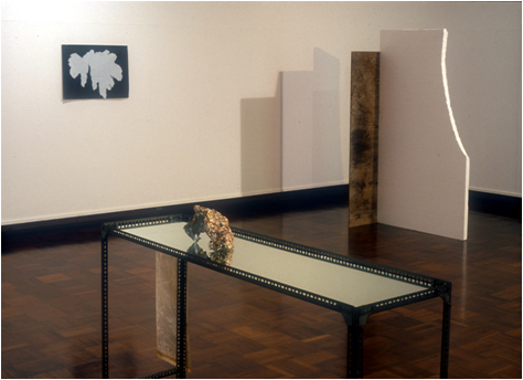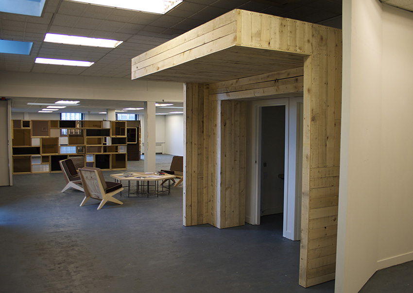 Installation shot, ‘Building Echoes’, Interview Room 11, Edinburgh (2015). ‘Shodhan Portal’, ‘Shodhan Hex Table and Chairs’, ‘Shodhan Screen’, Colin Lindsay (2015). Photo: Colin Lindsay